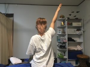 お腹の筋肉が引っ張られて腕を挙げるのを邪魔していたのが大きな原因でした。